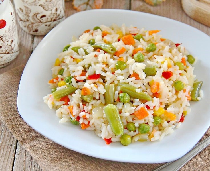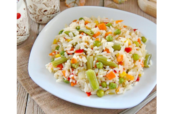 Рис, морковь, горох зеленый, кукуруза, фасоль стручковая.