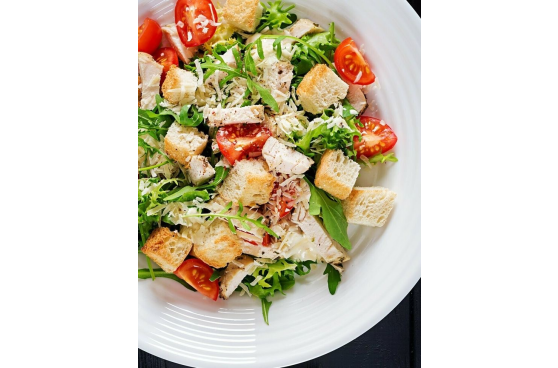 Курица, пекинская капуста, томат, сыр, соус, сухарики.
