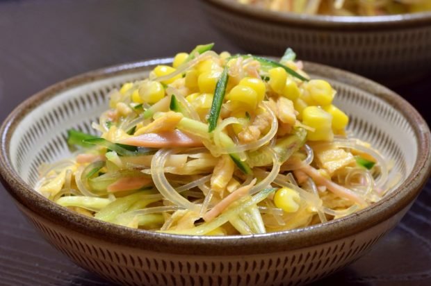 Ветчина, перец болгарский, фунчеза, огурец соленый, кукуруза, майонез.