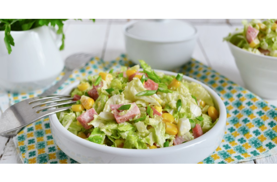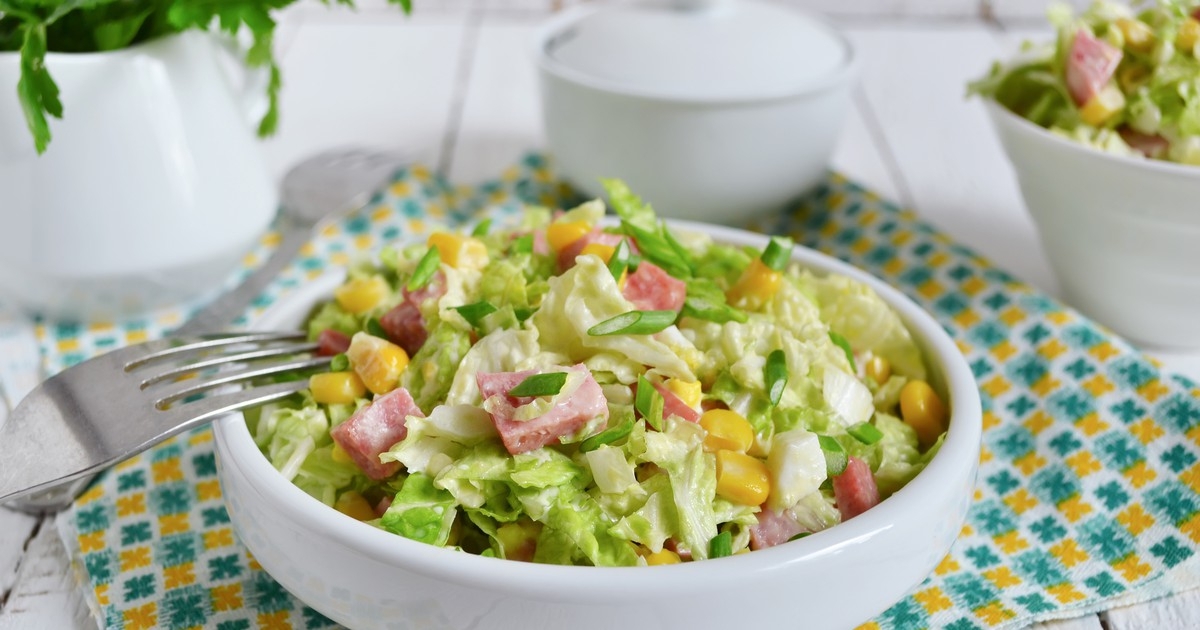 Пекинская капуста, ветчина, кукуруза, яблоко, лимон, майонез.