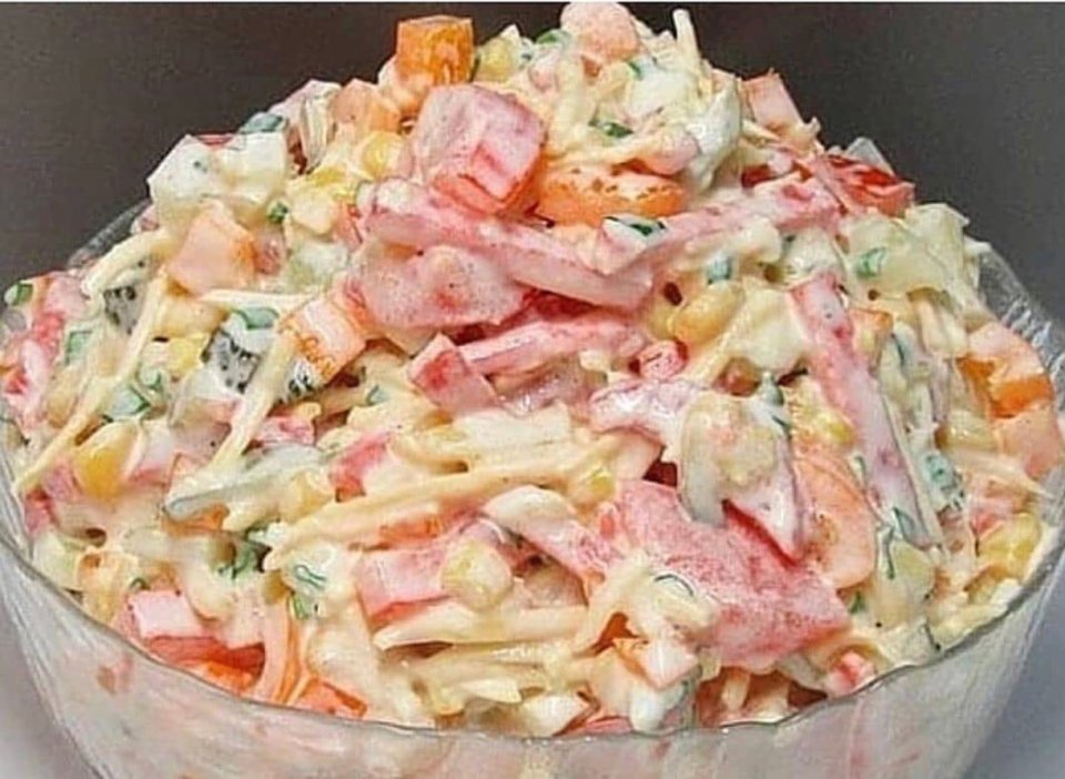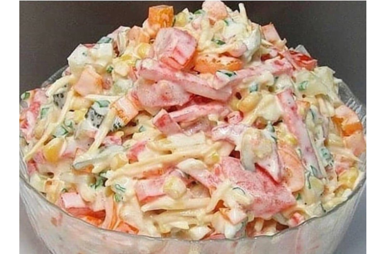 Огурец соленый, томат свежий, ветчина, яйцо, кукуруза, сыр, майонез.