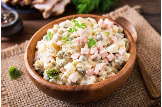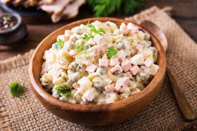 Яйцо, ветчина, картофель, соленый огурец, горошек, майонез.