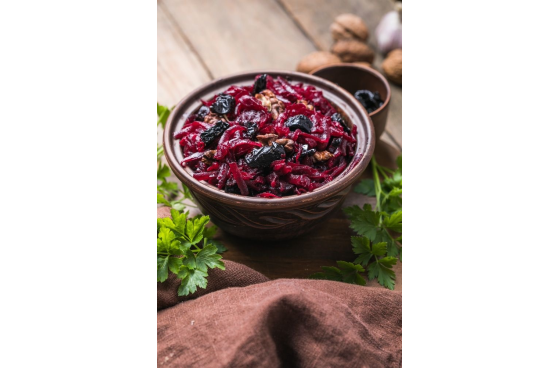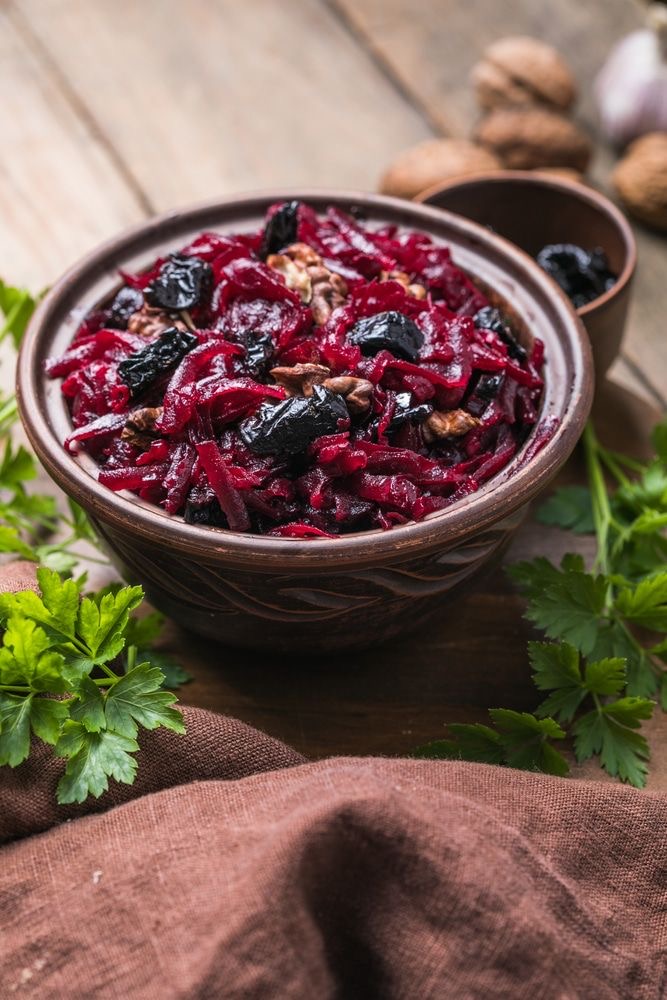 Свекла отварная, чернослив, орехи, майонез.